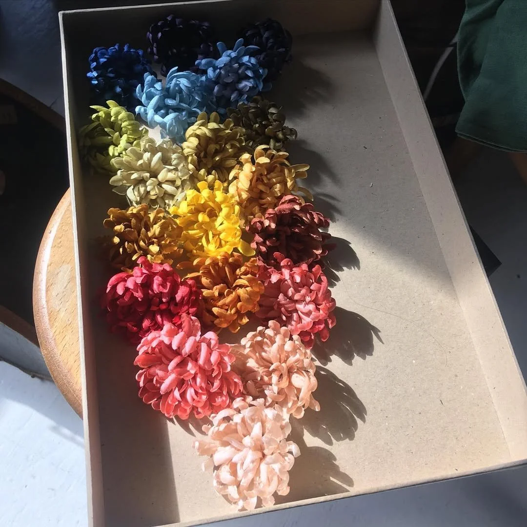 Des minis fleurs en teinture naturelle: de l'Avocat, de la Garance hâtive, de la Garance tardive, de l'Oignon de garde, du Cachou, de la Bourdaine, de la Sophora, de l'Oignon Rocambole, de l'Oignon de Brunswick, du Millepertuis, de la Sauge, de la Sophora Fera, de l'Indigofera, de l'Indigo, du Campêche et de l'Indigo de Campêche ! Qui dit mieux ?