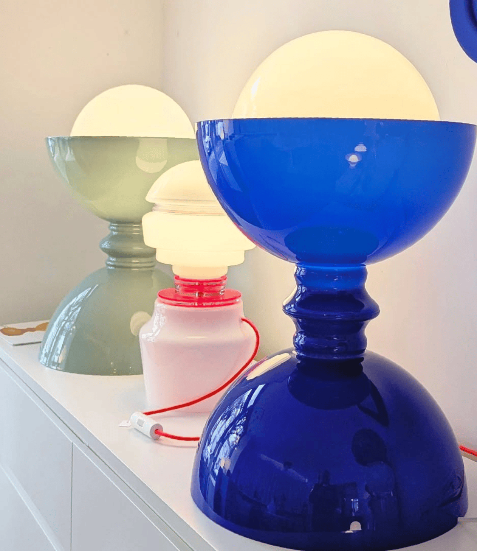 J’ai gardé le meilleur pour la fin et je termine cette année 2025 avec les lampes cosmiques de Valérie Menuet. Il suffit de regarder les photos de ses créations légèrement acidulées, inspirées du design italien du mouvement Memphis, pour comprendre qu’elles “éclairent autant qu’elles habitent l’espace où on les installe”.